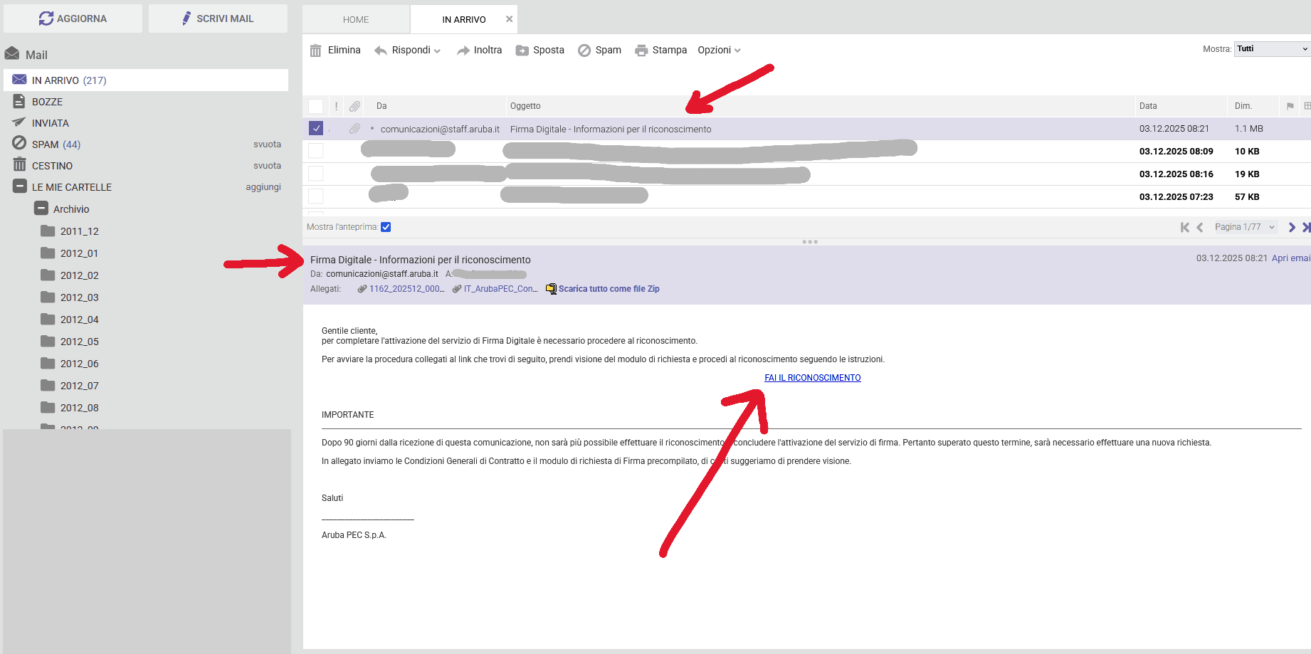 Accedi alla tua mail (dove ricevi le nostre comunicazioni), apri il messaggio di Aruba e clicca su "FAI IL RICONOSCIMENTO".