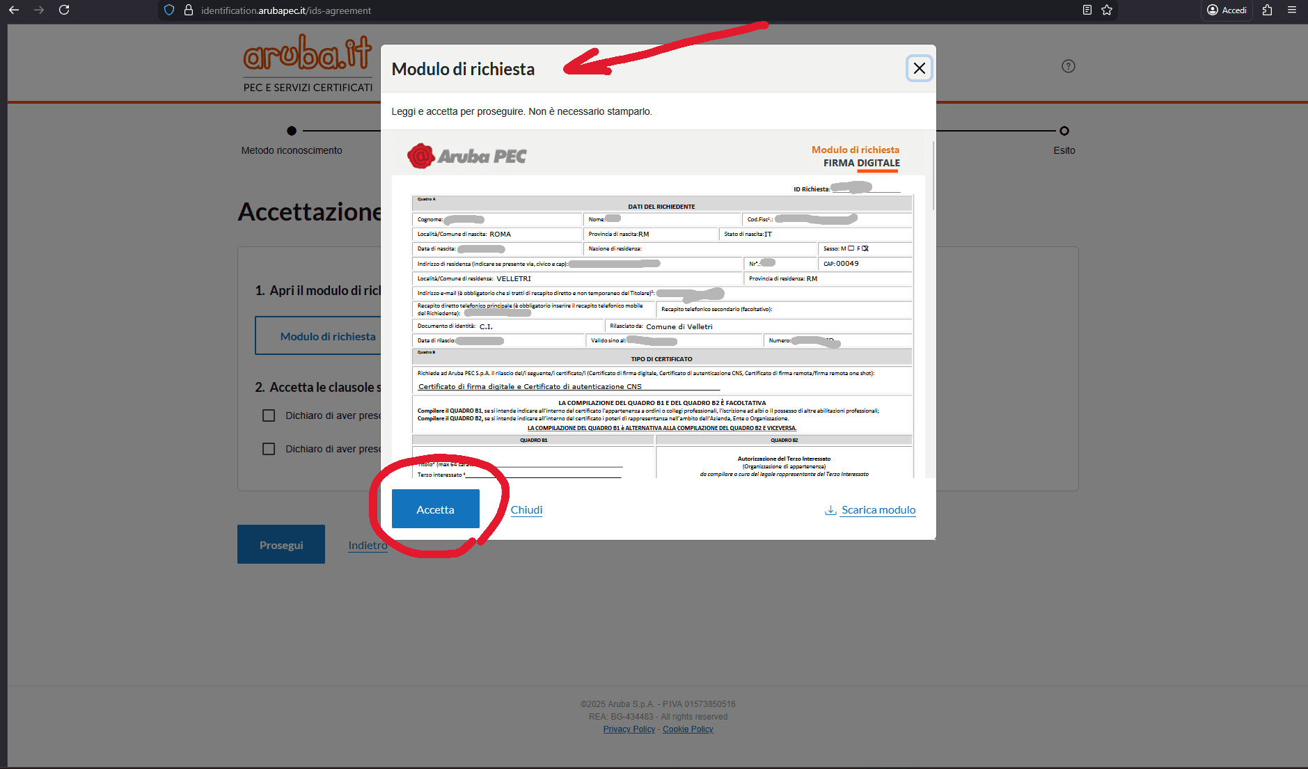Ora sei nel "Modulo di Richiesta". Clicca sul pulsante "Accetta" e il modulo si chiuderà.
